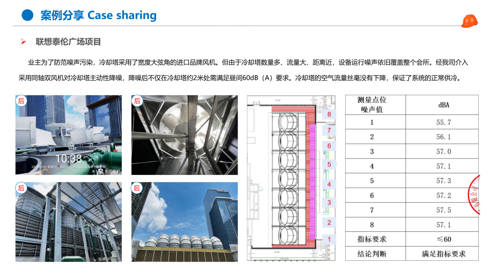 深圳聯想泰倫廣場在設備層新安裝了7臺橫流式冷卻塔,合計總冷卻水量3440m³/h。進風面噪聲總源強77.38 dB(A),嚴重影響鄰近會所正常使用,受 業主方委托我司在保證冷卻塔空氣流量不變的前提下對設備進行噪聲治理,要求治理后在冷卻塔約2米處需滿足晝間60dB(A)要求。